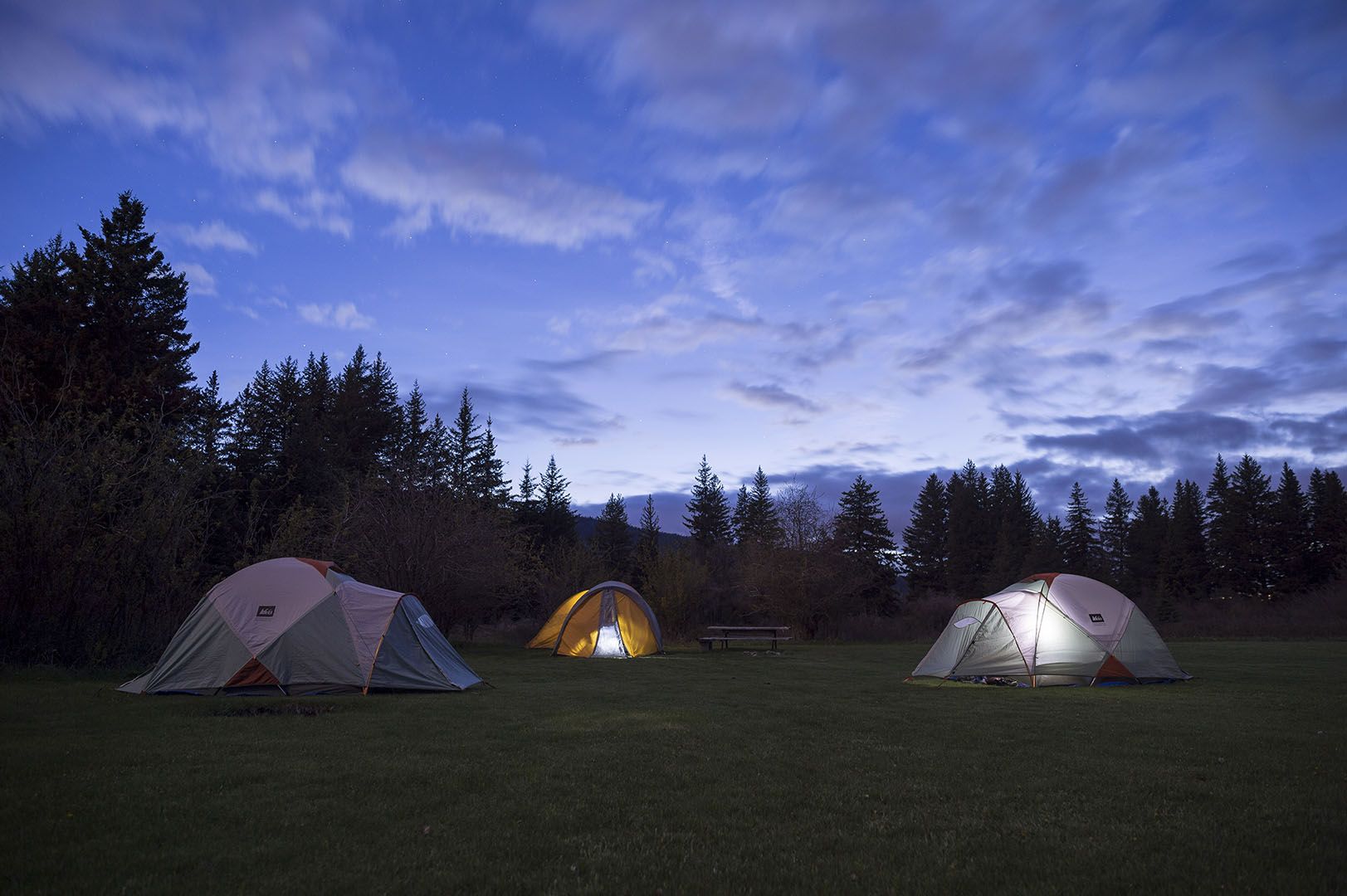 Unplugged from everything except the sky above, students and their professors call it a night at a Madison River campground near Yellowstone National Park on May 17. (Josh Kuckens/Bates College).