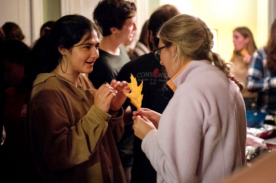 After dinner, students break into groups to discuss prompts chosen by the Multifaith Fellows. Thursday’s topics were “What are you excited to jump into?” and “What is something that is changing color in your life?”