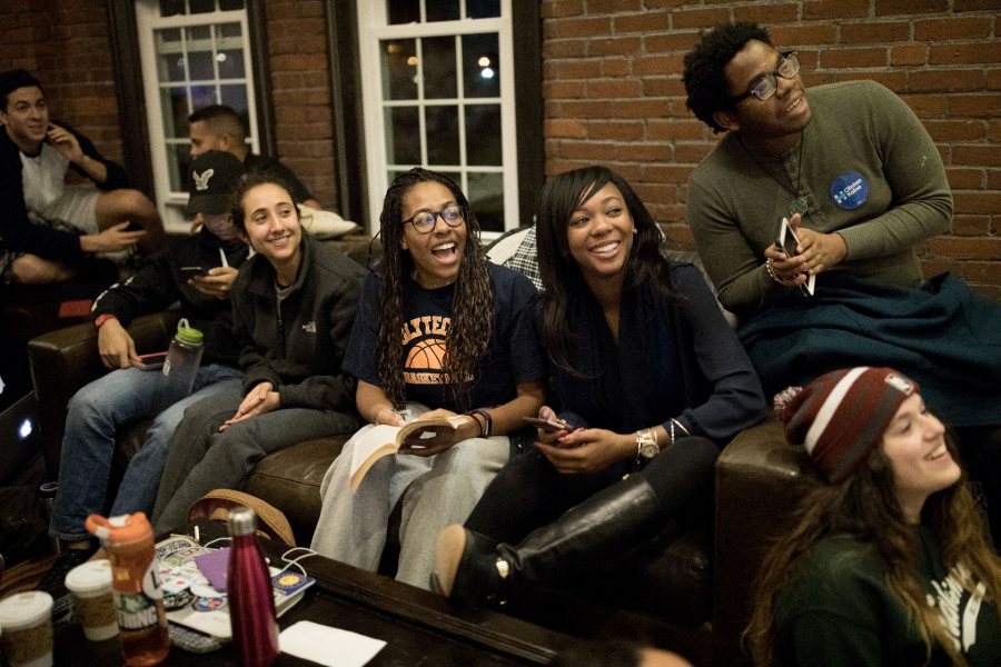 Arianna Fano ’19 of Lincolnshire, Ill., and classmate Zoe Seaman-Grant ’17 of Charleston, S.C., had spent the entire day encouraging fellow students to vote. “One of my favorite things about Bates is how politically active it is, and that’s why I came here,” Fano said around 10:30 p.m. “It’s nice to come together as a community and watch the results…even if it doesn’t go well.”