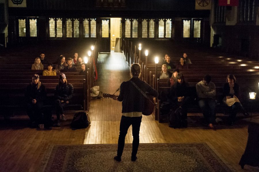The service runs about half an hour, beginning and ending with the playing of a crystal singing bowl, a traditional Eastern meditation aid whose sound reverberates throughout the chapel. In between, students offer readings, songs, or dance. “You get to sit back in the middle of the week in a candlelit chapel and just be,” said Denali Nalamalapu ’17 of Falmouth, Maine.