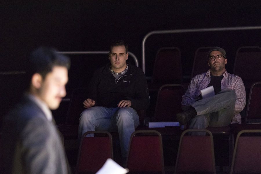Director Samuel Wheeler ’17 (left) and technical director Justin Moriarty watch the actors in a dress rehearsal for The Pillowman.