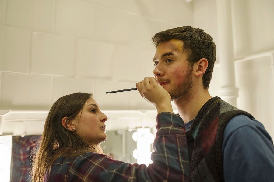 Maddy Bruno '17 of Denver applies makeup to Nate Stephenson '18 of Ellsworth, Maine, before a dress rehearsal for The Pillowman.