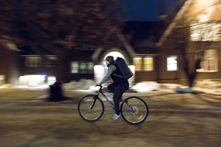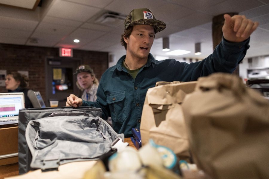 The delivery staff, which on Wednesday comprised Niiler, Thorn Merrill ’19 of Morrisville, Vt., and Hadley Moreau ’19 of Falmouth, Maine, gains an intricate knowledge of Bates geography.