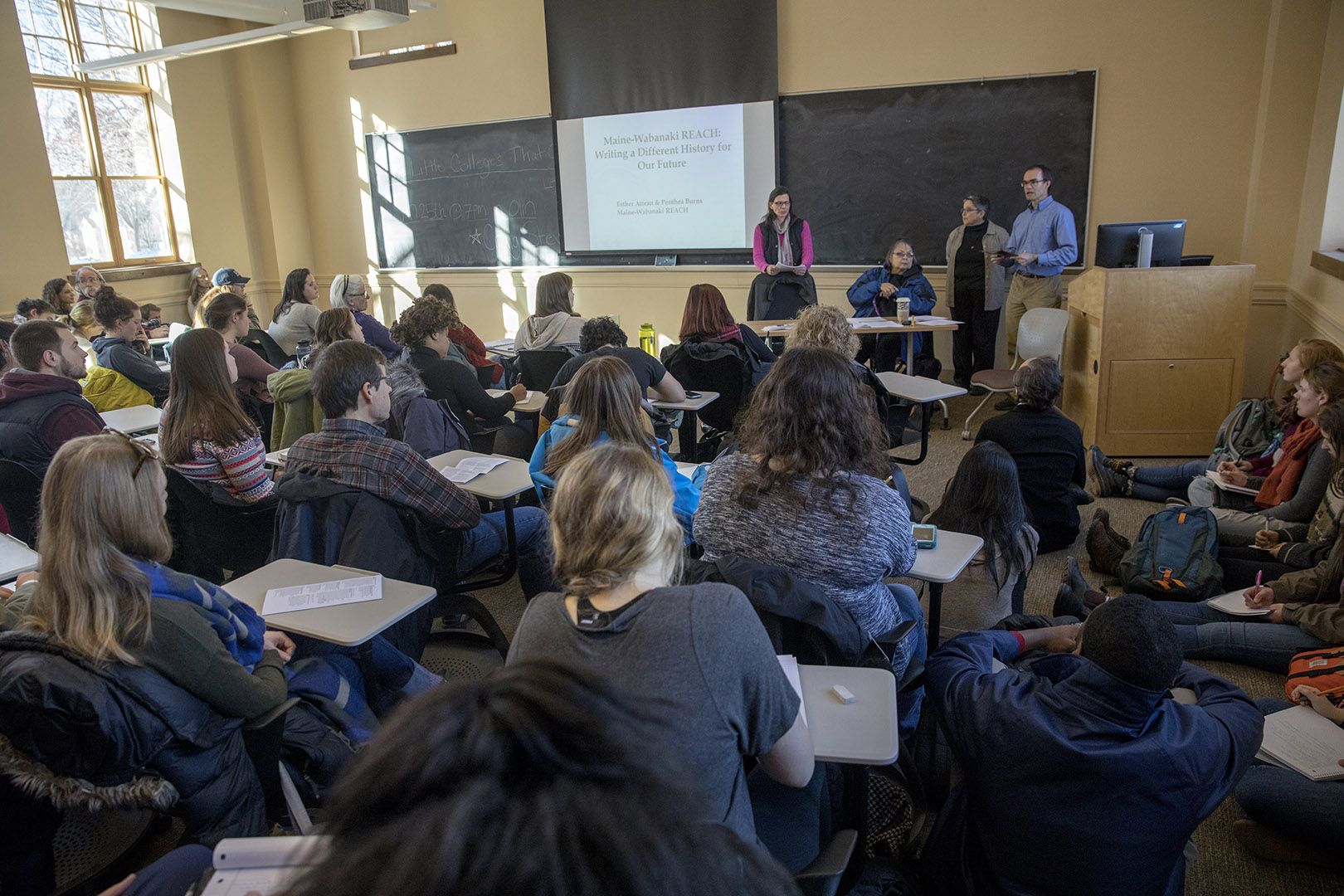 In a full Hedge Hall classroom, Associate Professor of History Joe Hall (right) introduces, from left, Esther Attean, Kathy Paul, and Penthea Burns, women at the forefront of efforts in Maine to confront, expose, and help to heal the harm done to Native American children by the state’s child welfare system.