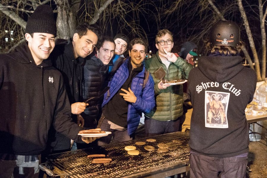 Members of the Bates Shred Club and friends pose for a photo as they grill behind Smith Hall at Skill 'N' Grill.