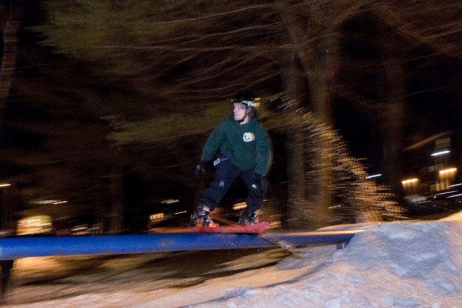 Thorn Merrill '19 of Morrisville, Vt., take to the rail jam behind Smith Hall.
