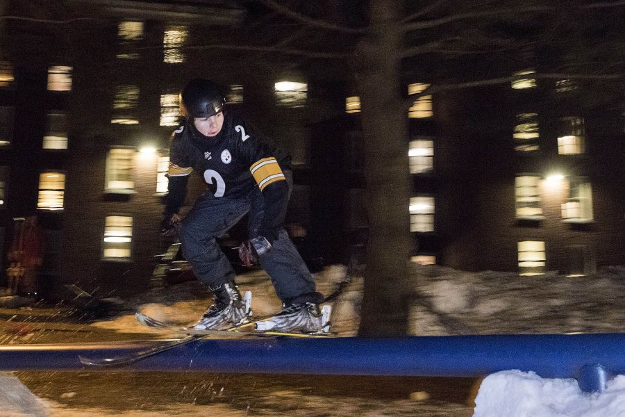 Skiers and snowboarders get ready at the top of the rail jam behind Smith Hall during Skill 'N' Grill on Jan. 17.
