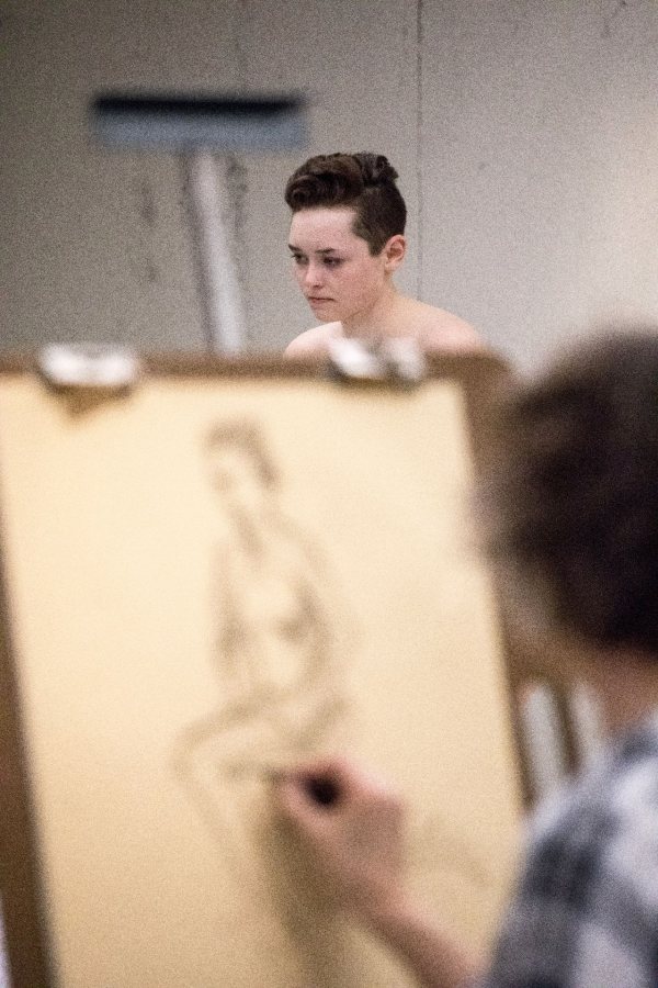 Meghan Cleary ’18, an art and visual culture major from South Burlington, Vt., was the model for this session in the weekly Life Drawing series. New to modeling this year, Cleary has already gained a level of comfort. “I was a little nervous the first time, but once you’re up there it’s pretty easy to zone out,” she said. “It’s more like just drawing shapes, rather than seeing a naked person.”