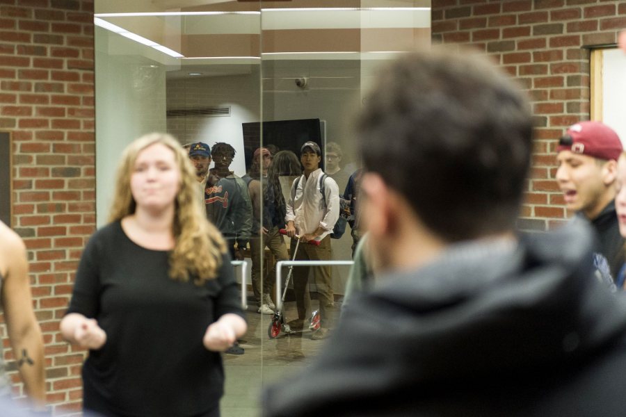 The group began rehearsal in a spot favored by a cappella groups, thanks to its reverberant acoustics: the lobby between the closed doors of the Bates Museum of Art and the rest of Olin, known as the glass box.