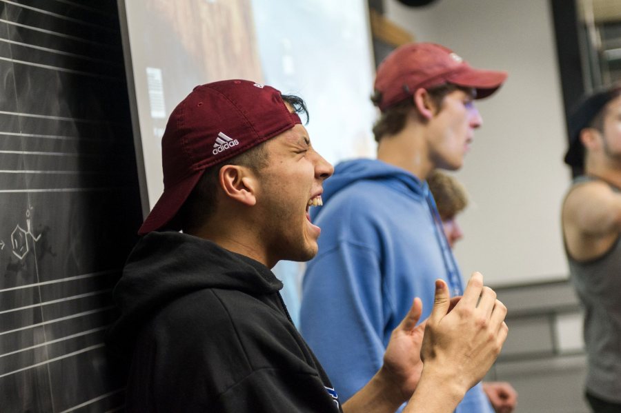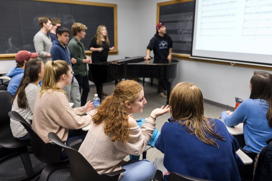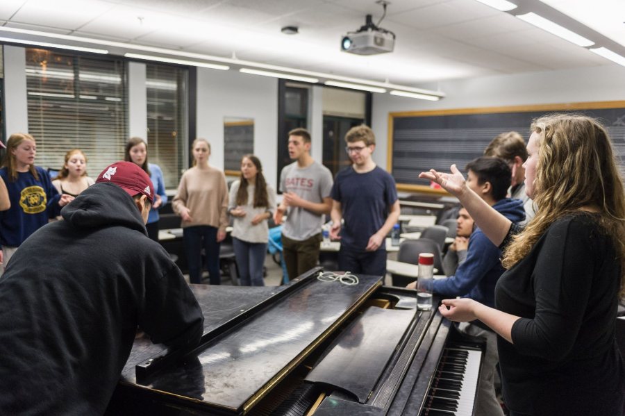 On Wednesday night, the Crosstones, one of Bates’ half dozen a cappella groups, rehearsed in the Olin Arts center, and this camaraderie was in full voice.