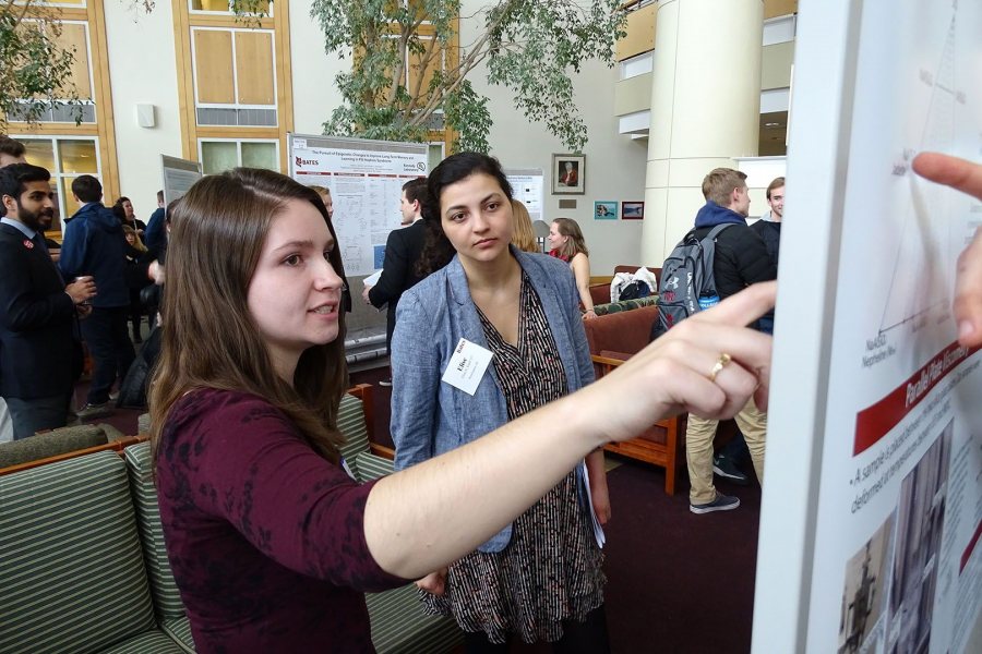 Here, senior geology major Gwenyth Williams of Newbury, Vt., talks with classmate Elise Emil of Washington, D.C., about her poster, “Paleoenvironmental Reconstruction from the Sediment Record of the Varved Proglacial Linnévatnet, Svalbard.”