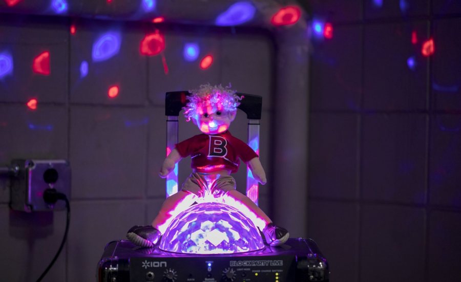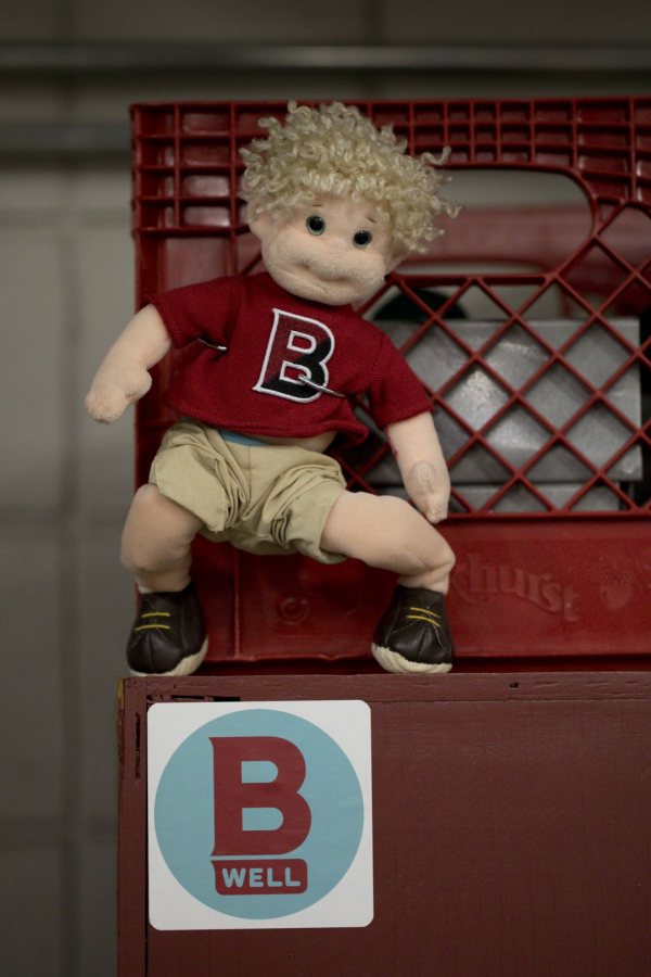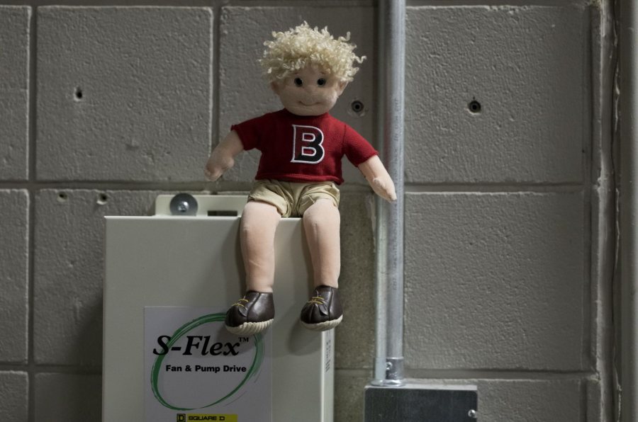 A curly-haired stuffed doll sits on a boom box in a Merrill Gymnasium room in which Bates wellness manager Mike Milliken stores exercise gear.