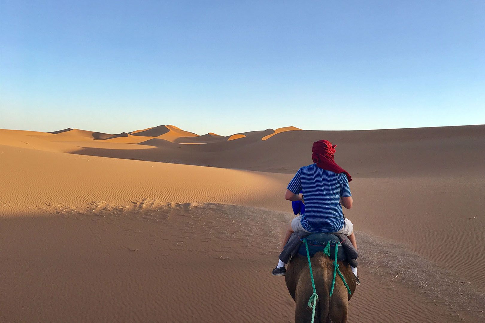 About the photograph: After a nine-hour drive from Marrakech through the High Atlas mountain range, we arrived at the camp where we would stay that night. We got on camels and trekked to see the Saharan sunset.