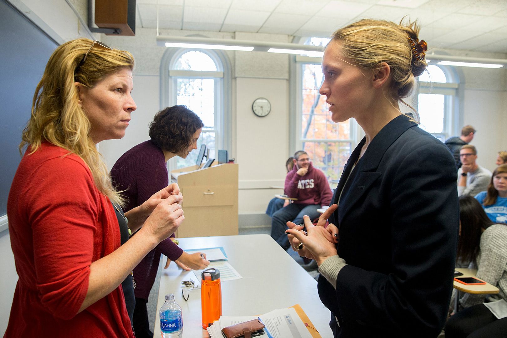 Associate Professor of Rhetoric Stephanie Kelley-Romano, at left, confers with Molly Chisholm during the fall 2017 course “Presidential Campaign Rhetoric.” As Chisholm has honed the Senior Address she’ll be giving May 28 at Commencement, Kelley-Romano has been a valued adviser. (Phyllis Graber Jensen/Bates College)