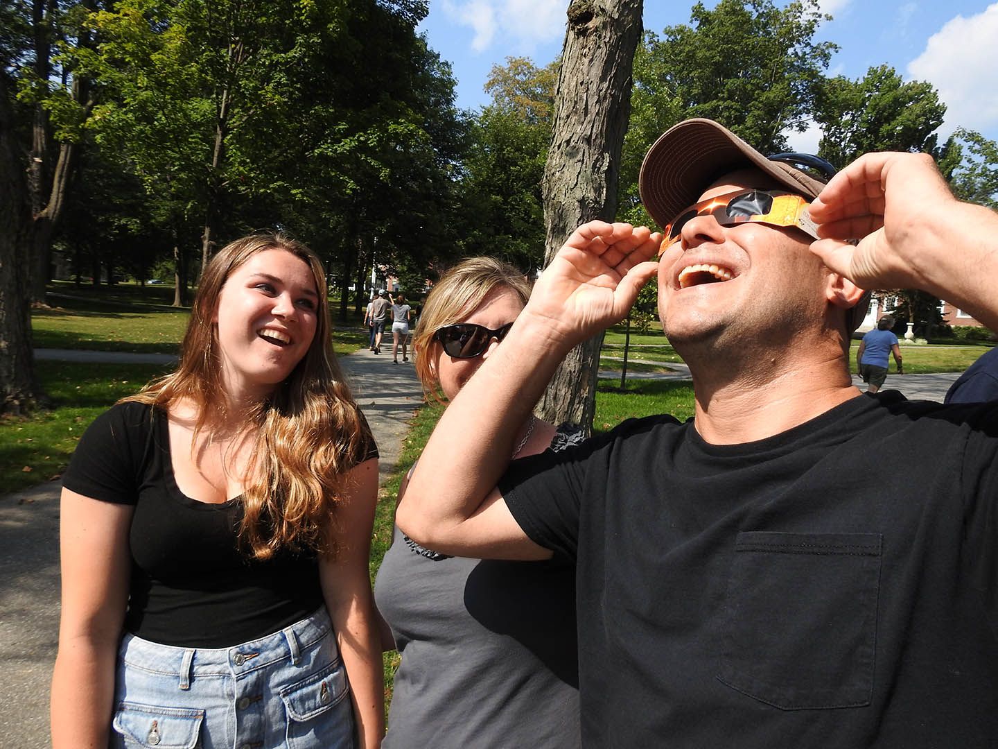Pete Culcasi of Northbridge, Mass., looks at the eclipse through protective eyeglasses with his daughter, Maddie (left), and wife, Jody. A welder by trade, Pete had also brought protective welder’s glass. (Jay Burns/Bates College)