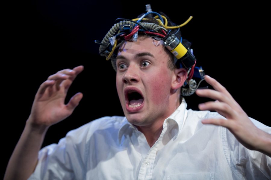 The Everyman ends up being committed, believing he is watched over by the Grand Inquisitor of Spain. Last summer, Stephenson received a Phillips Student Fellowship to study theater in Moscow. (Phyllis Graber Jensen/Bates College)