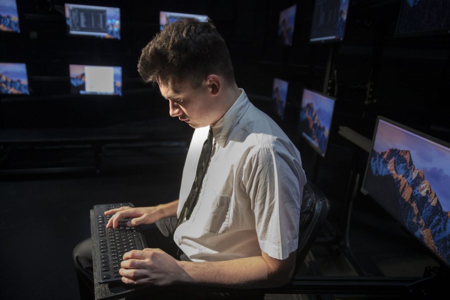 The play, adapted by Senior Lecturer in Theater Katalin Vecsey, is set in the present day — Siri replaces a servant and the main character blogs instead of journals — and the set features video walls that display the inner workings of Everyman’s mind as he loses his grip on reality.