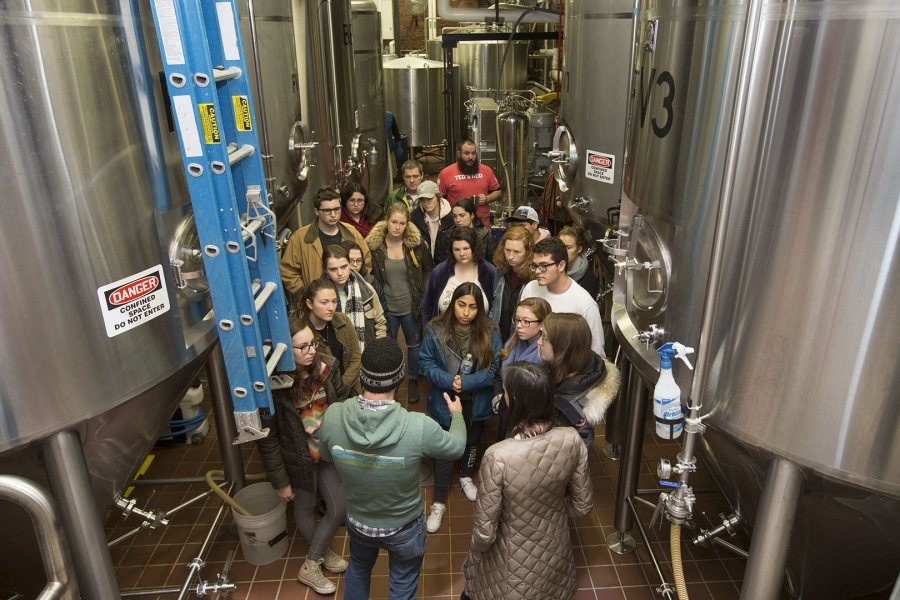 Touring the Baxter Brewery Co. in Lewiston’s Bates Mill are Assistant Professor of Biology Brett Huggett and students in his course on how humans use plants. The visit complemented class discussions about the use of hops, barley, and fungi in beer production and the science and history of beer brewing. (Phyllis Graber Jensen/Bates College)
