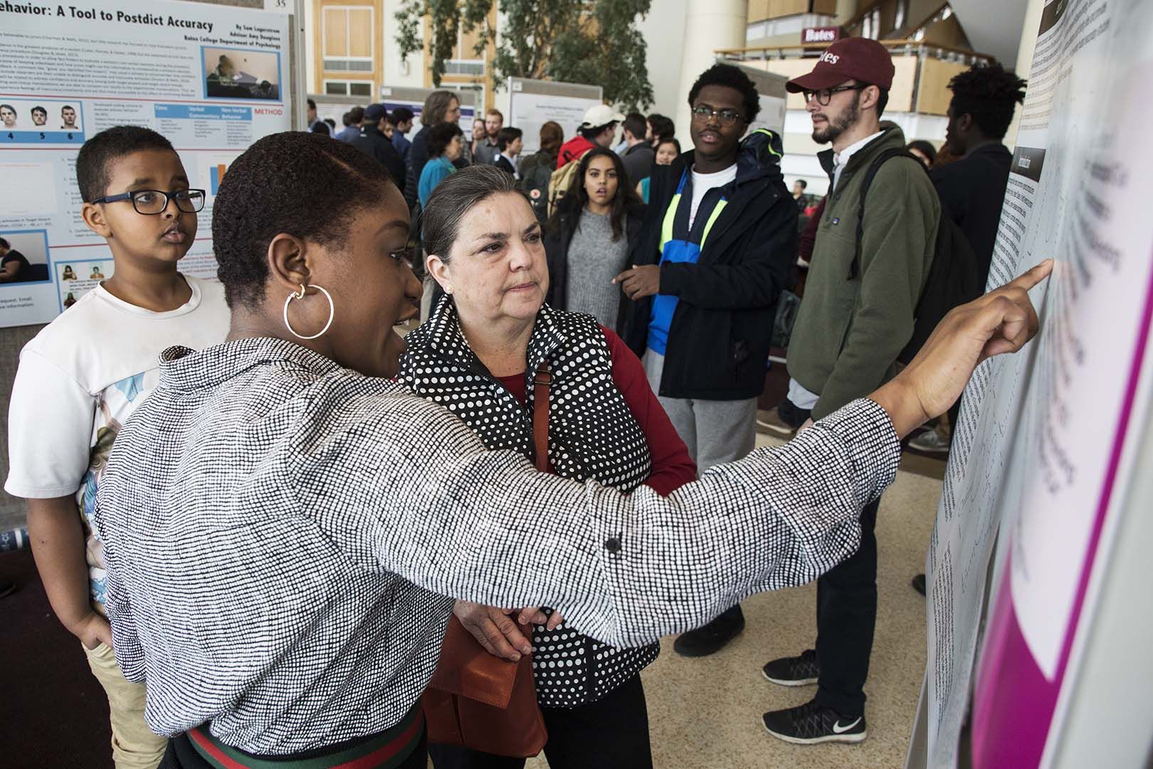 Kwamae Delva ’18 of Conley, Ga., draws a consistent crowd, including Jeff Sturgis ’69, an Alumni Council member and the College Key president, as he talks about analyzing high-velocity outflows in compact starburst galaxies.