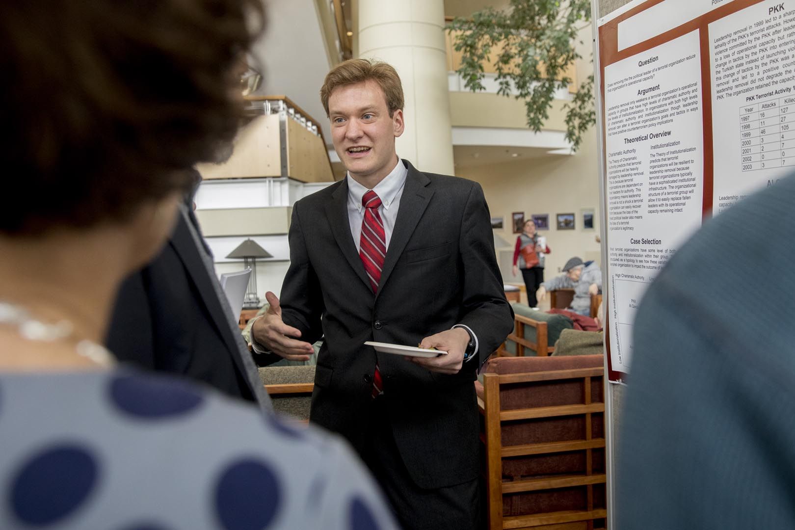 Stephen Rowe ’18 of Gambier, Ohio, discusses his politics research. Rowe challenges a conventional theoretical belief about terrorist organizations: that high levels of “institutionalization” — that is, sophisticated institutional infrastructure — and charismatic authority are mutually exclusive.