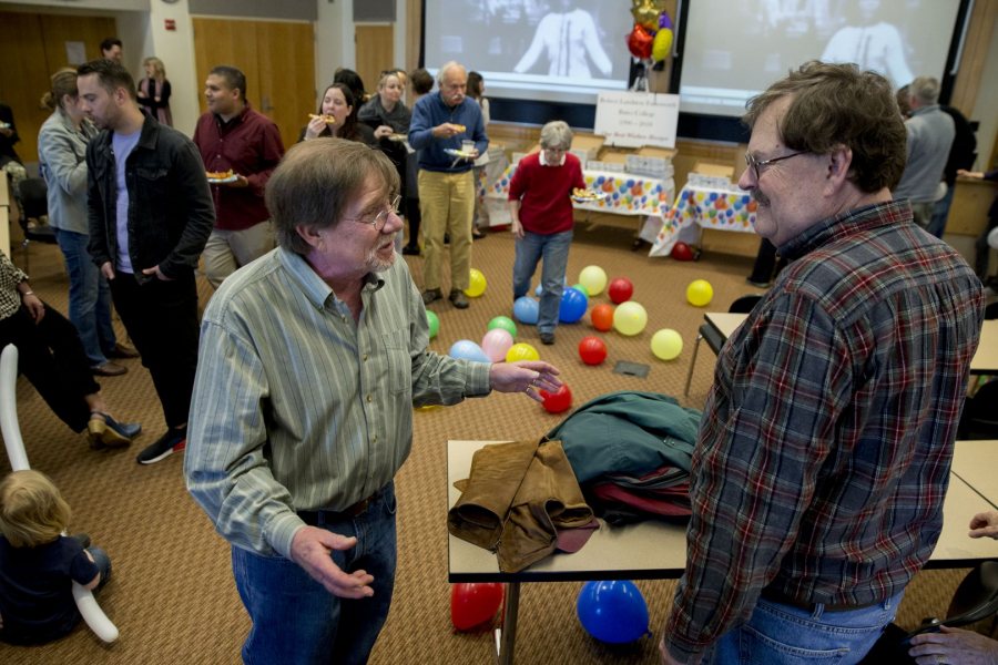 Senior Lecturer in English Robert Farnsworth greets Professor of History Michael Jones during a surprise retirement party in Pettengill Hall. A month before, Jones had his own retirement event. (Phyllis Graber Jensen/Bates College)