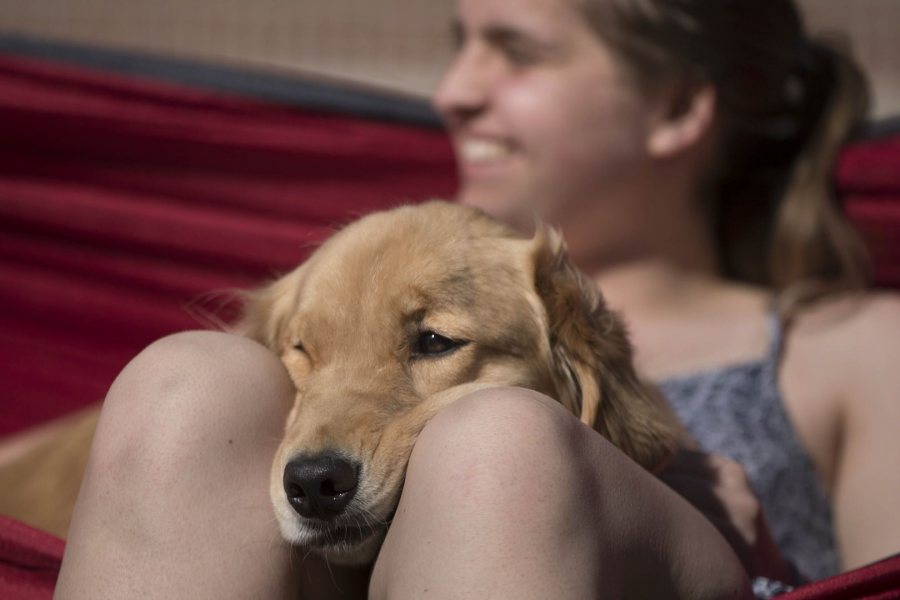 Neuroscience major Julie Self ’18 of Redwood City, Calif., takes a break from Short Term research with Tilly, a golden retriever on loan from Molly Newton ’11, assistant dean for residence life and health education. (Phyllis Graber Jensen/Bates College)