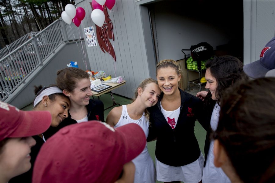 Hannah Londoner ’19 of Westport, Conn., places her head on the shoulder of Maisie Silverman ’18 of Brunswick, Maine, as the women’s tennis team huddles before playing their last home match of the season against Bowdoin at the Wallach Tennis Center, where the team honored Silverman, its only senior, on Senior Day. (Phyllis Graber Jensen/Bates College)