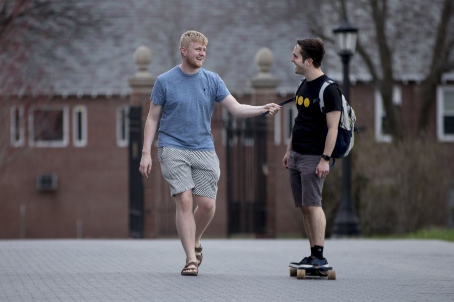 By foot and by skateboard, Ross Ackerman ’19, left, of Houston and Peter Cottingham ’18 of Manchester, Mass., head to Commons. (Phyllis Graber Jensen/Bates College)