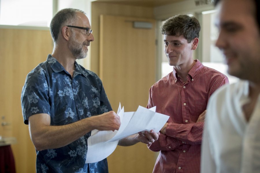 At the annual faculty reception to celebrate seniors who completed honors theses, Professor of Biology Don Dearborn and Ben Tonelli ’18 of Seattle discuss plans to adapt his thesis for an academic journal. Tonelli’s thesis describes a singular achievement: He created the first mathematical model to visually illustrate the movement of ticks as they hitch rides with songbirds migrating south. (Phyllis Graber Jensen/Bates College)