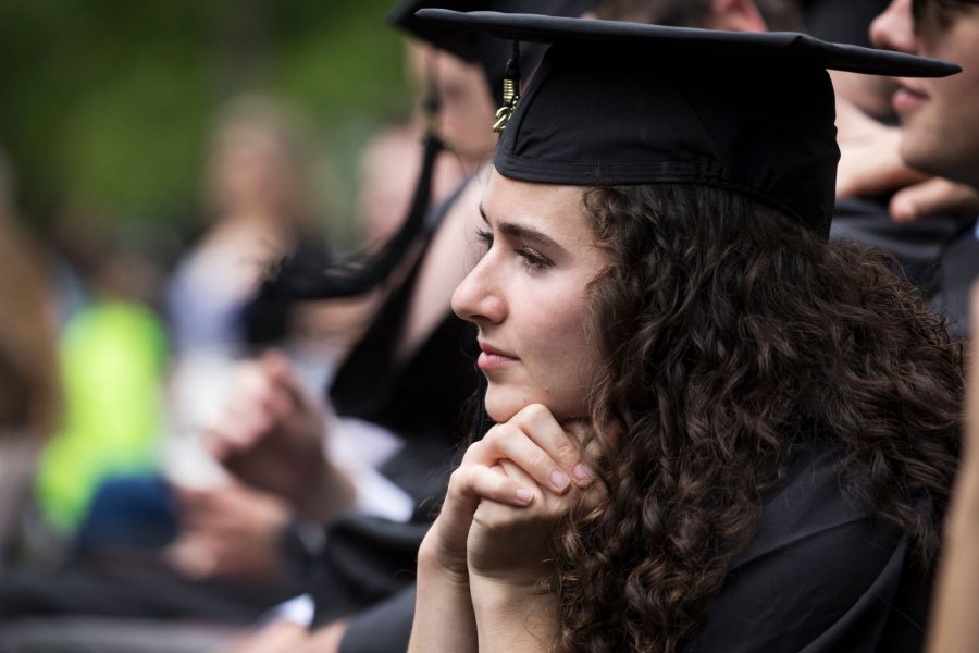 Lindsey Beauregard ’18 of Hollis, N.H., listens during Commencement on May 27, 2018. (Theophil Syslo/Bates College)