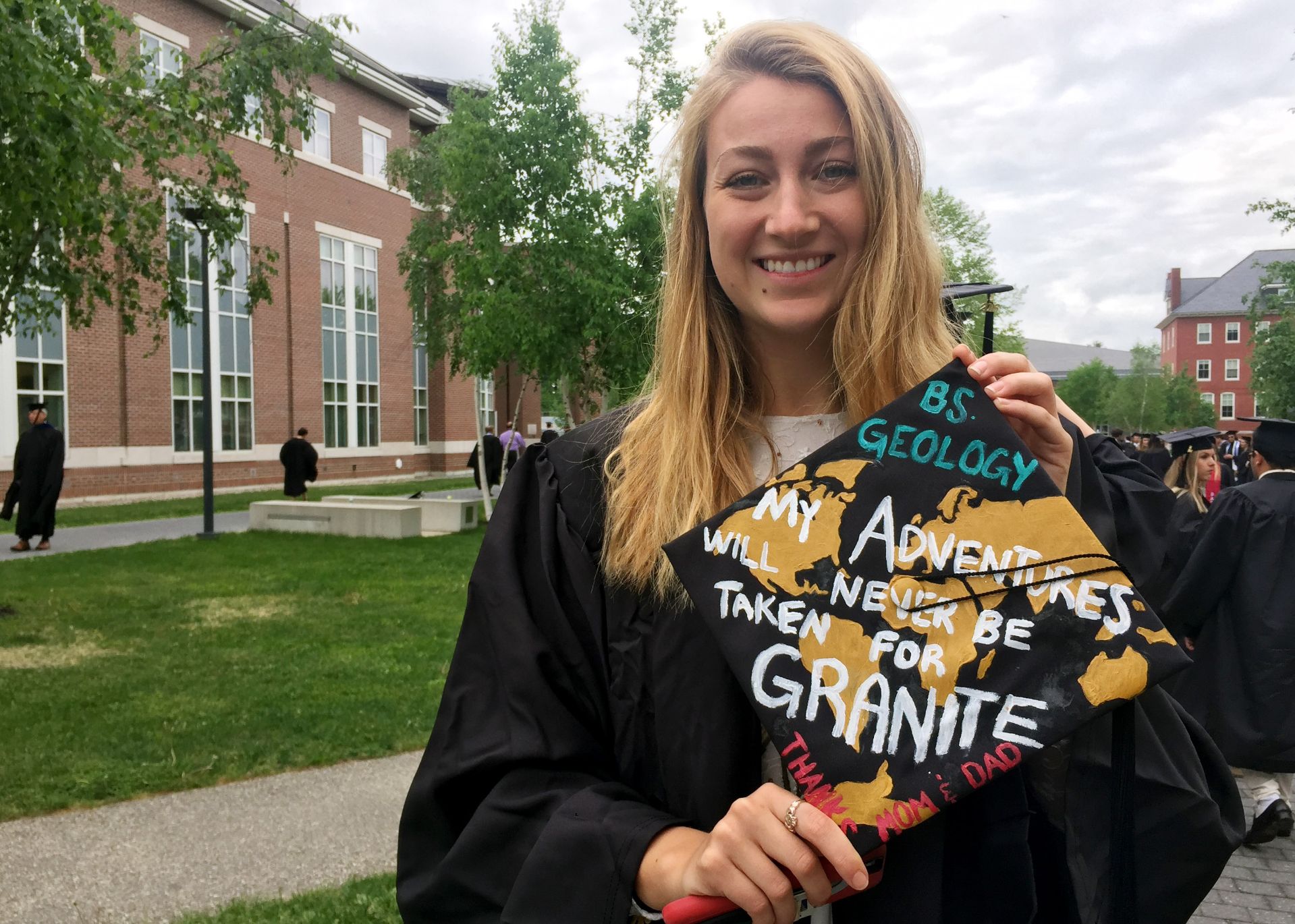 The cap: “B.S. Geology — My adventures will never be taken for granite — Thanks Mom & Dad”