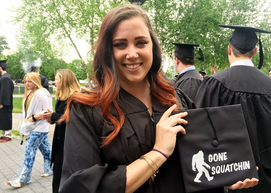 Kelly Philbrook ’18 of Auburn, Maine, is a Bigfoot believer who once went “squatching” — searching for Sasquatch — in the White Mountains. She ordered a sticker to put on her cap.
