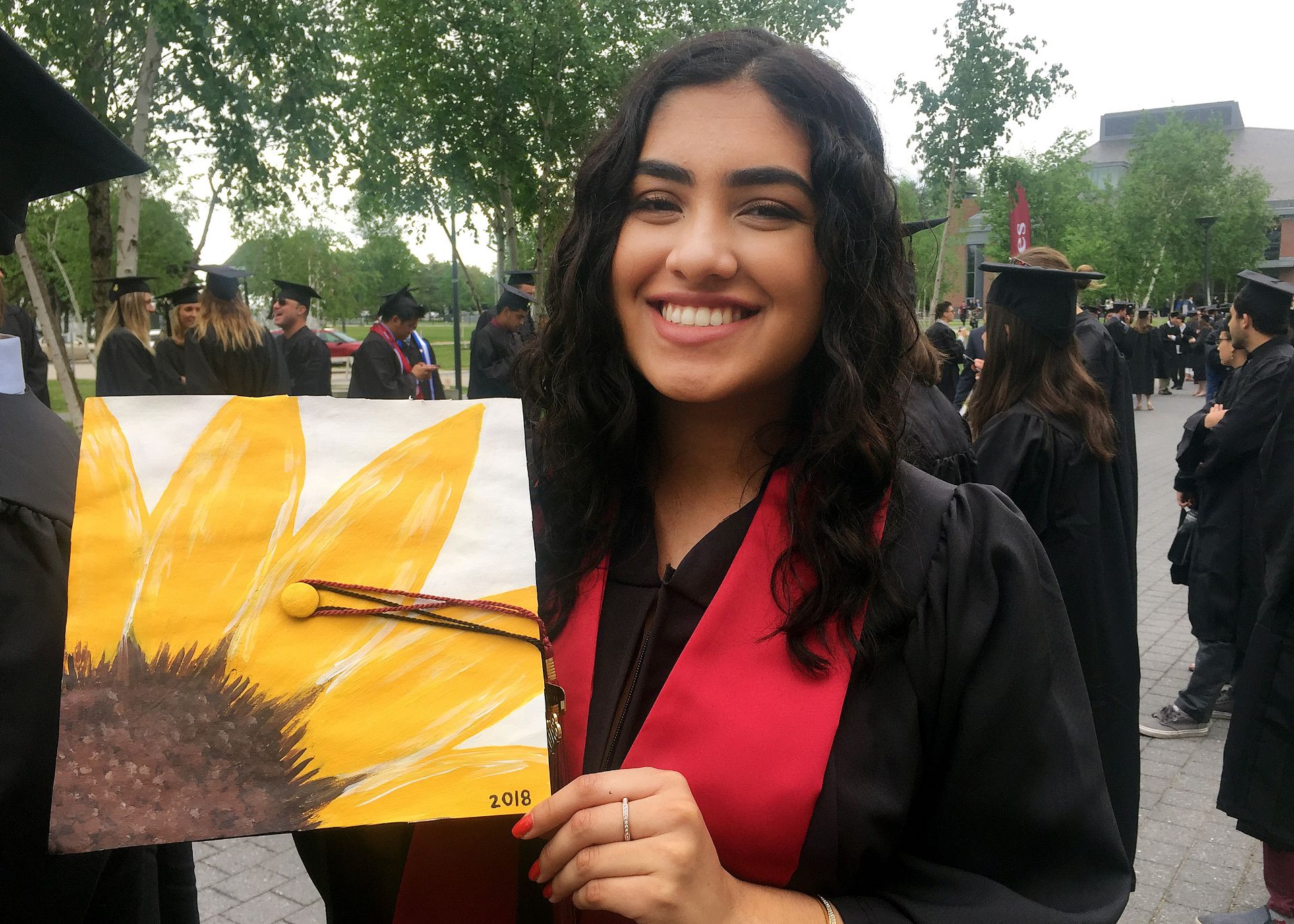 Ivette Partida ’18 of Norwalk, Conn., painted a sunflower on her high school graduation cap. She decided to do the same for college.