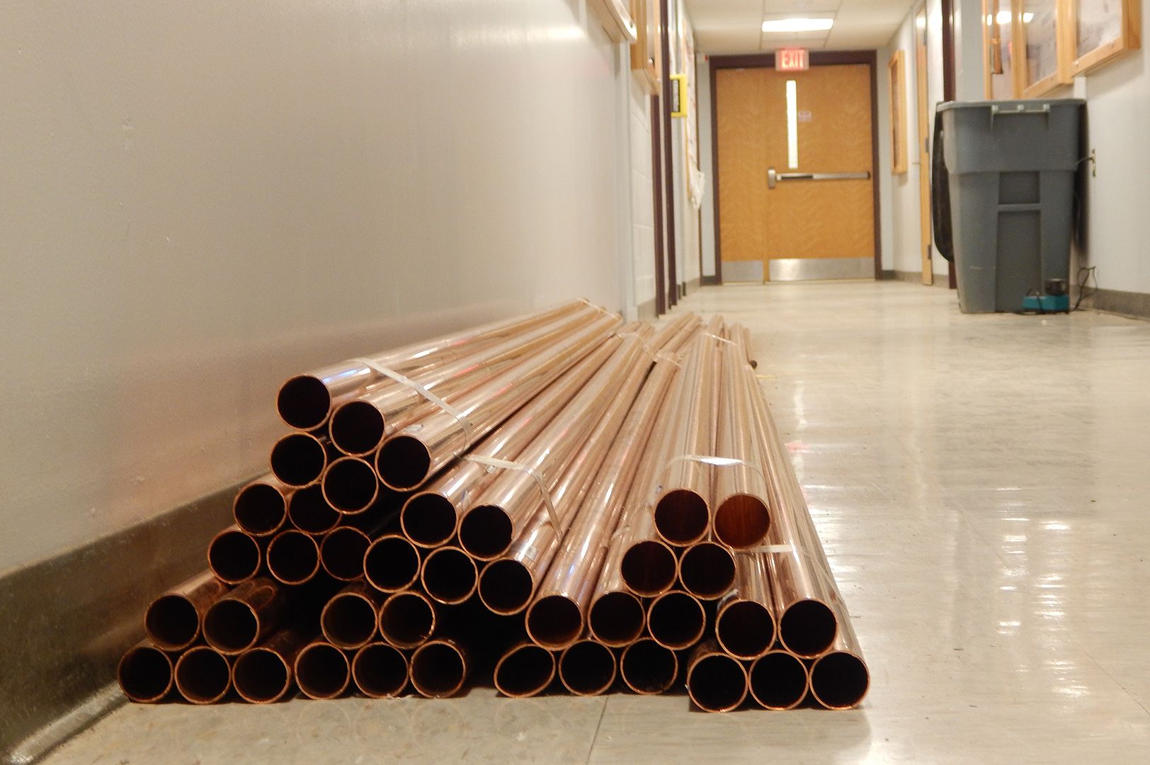 Copper pipe is stockpiled in a Carnegie Science Hall corridor on June 6, 2018, as plumbers for Damon Mechanical upgrade the domestic hot water system. (Doug Hubley/Bates College)