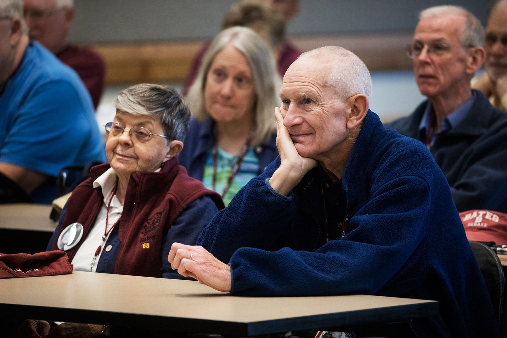 Christine Hager ‘68 and Jack Pickard ‘68 listen to classmate Richard Gelles present his Reunion Seminar on “Why Social Security Isn’t Going Broke” on June 8. (Theophil Syslo/Bates College)