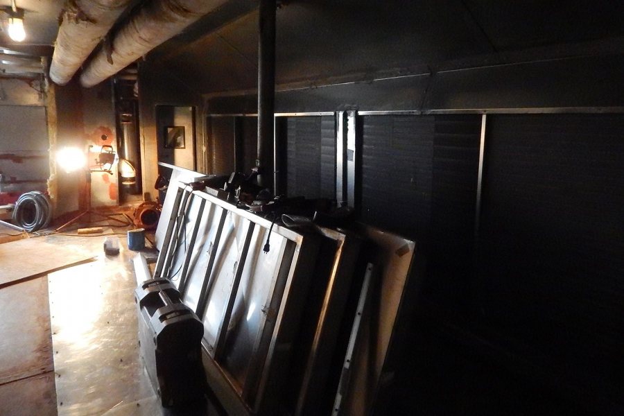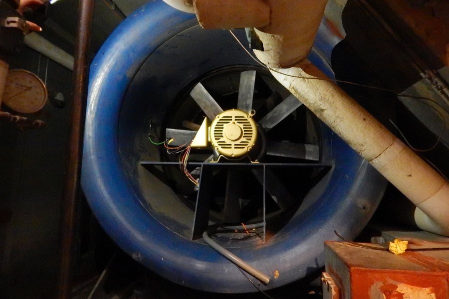 The chamber at the rear of the penthouse is the return room. Here, along with pipes and valves installed at just the right height to gouge a careless visitor’s scalp, lurks the return air fan. Resembling a jet engine from the front, this machine is formidable and deeply embedded in the air handler’s structure. As its housing is still usable, replacing the motor and blades was sufficient for the overhaul.