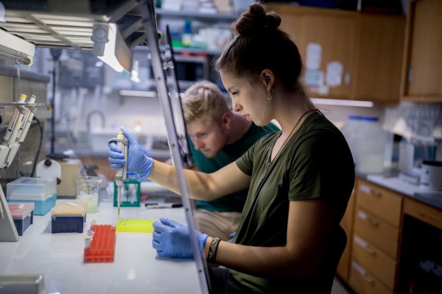 Bridget Tweedie ’21 of Brownfield, Maine, and Ross Ackerman ’19 of Houston did summer research in the lab of Professor of Biology Don Dearborn, where the three have studied the avian immune system of Leach’s storm-petrels. The research is supported by a major grant from the IDeA Networks of Biomedical Research Excellence, an NIH program. (Phyllis Graber Jensen/Bates College)