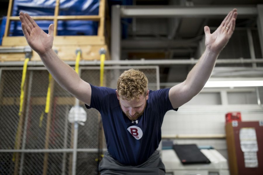 Mike Milliken, who directs the college’s wellness program, B-Well, leads an 8 a.m. boot camp for faculty, staff, and students in Merrill Gymnasium. (Phyllis Graber Jensen/Bates College)
