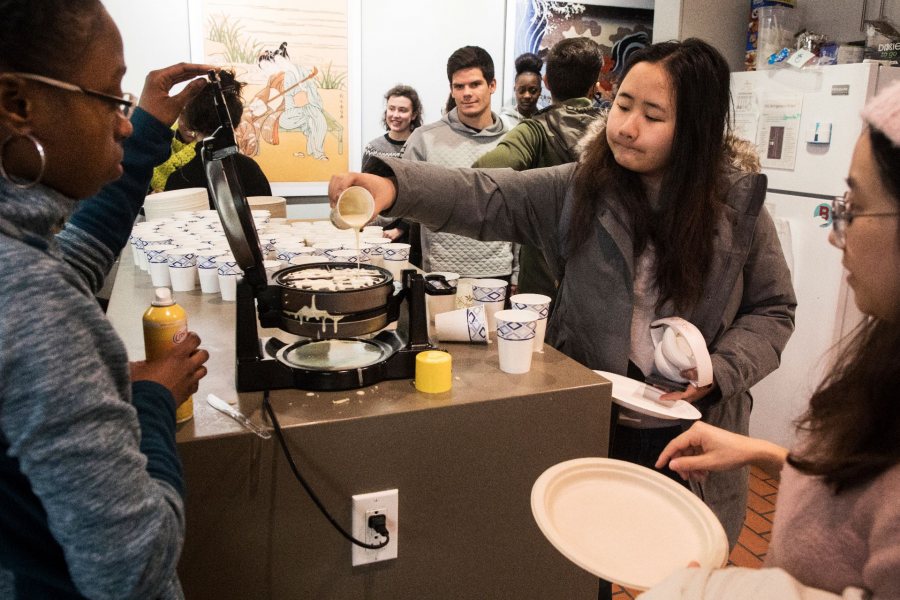 In the midst of finals pressure, Waffle Night is “something that students look forward to,” says Charlene Holmes, assistant dean for first-generation student support. “It’s also an opportunity for the entire student body to come to the OIE to break bread together.”