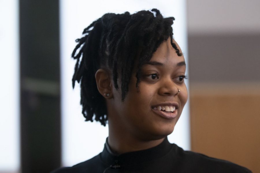 A doctoral student in feminist studies at the University of Minnesota, AK Wright ’17 discussed prison abolition and the experience of black transgender people in America’s carceral state. (Phyllis Graber Jensen/Bates College)