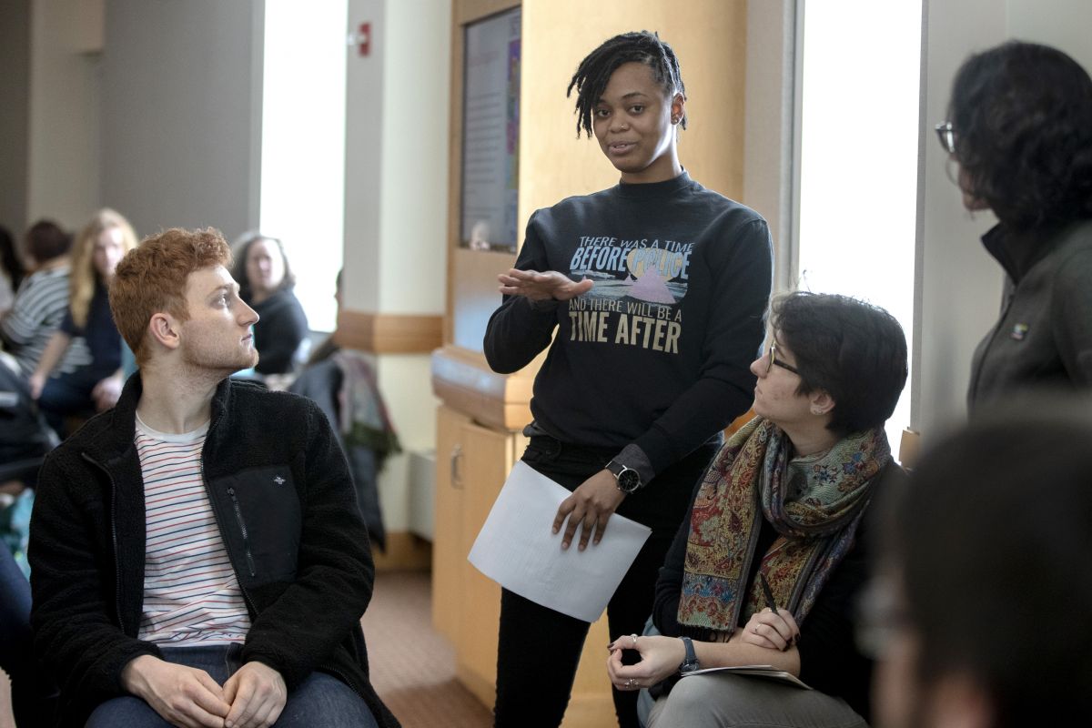Trisha Kibugi ’21, shown in 2018 making a spoken-word presentation at the Africana Fashion Show, led an MLK Day 2019 discussion about effective allyship. (Durotimi Akinkugbe ’18/Bates College)