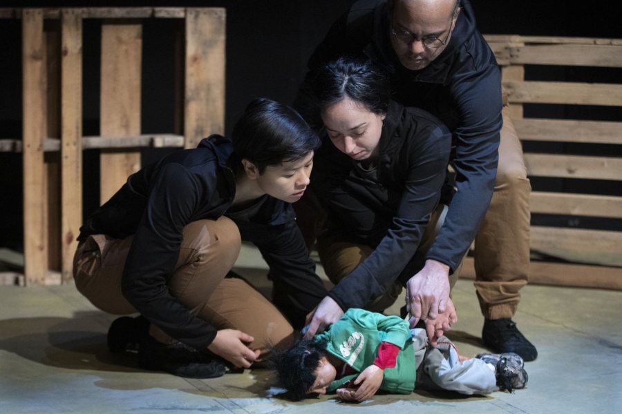 Sandglass Theater performers Keila Ching ’19, Shoshana Bass, and Alan White animate a puppet during a Gannett Theater dress rehearsal of Babylon, Journeys of Refugees. (Phyllis Graber Jensen/Bates College)
