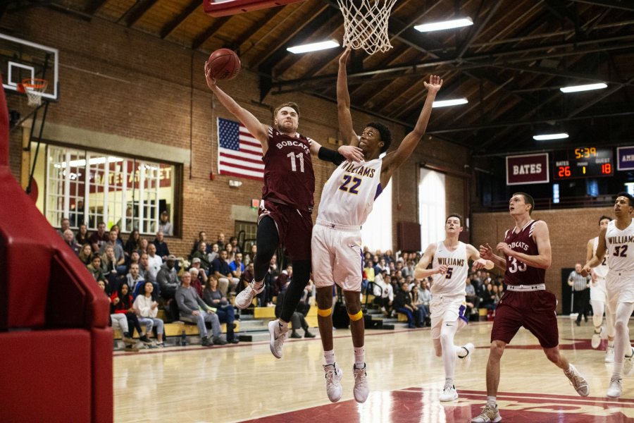Jeff Spellman ’20 of Boston, Mass., had 15 points, eight rebounds, and a game-high seven assists against Williams in January at Alumni Gymnasium. (Theophil Syslo/Bates College)