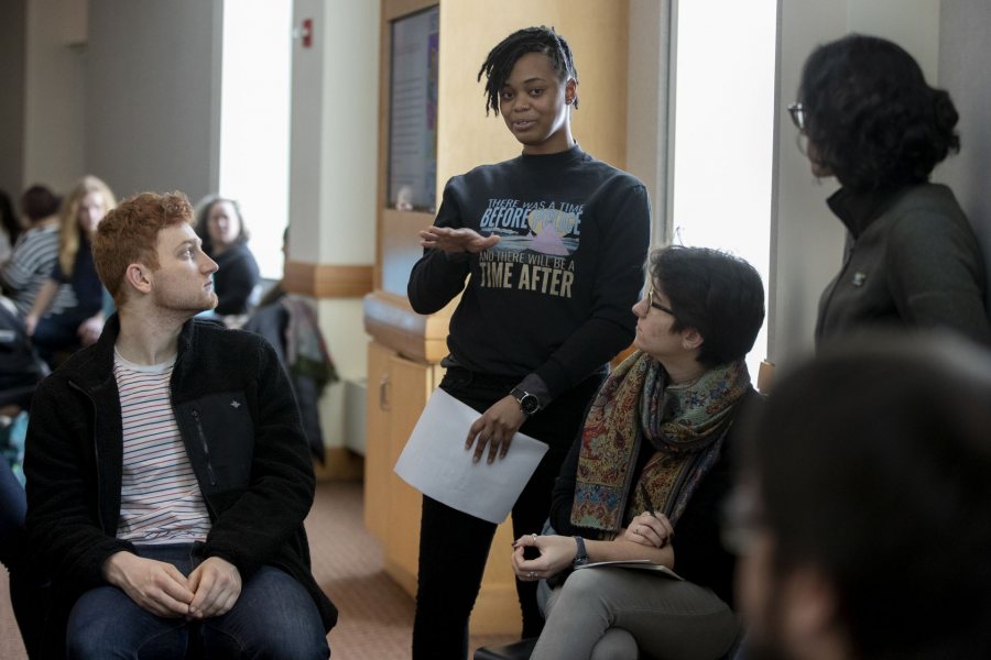 AK Wright ’17, a doctoral student in feminist studies at the University of Minnesota, leads a workshop discussion on MLK Day at Bates arguing that the problems of America’s racially biased criminal-justice system — one that particularly harms black transgender individuals — can only be solved through its abolishment. (Phyllis Graber Jensen/Bates College)