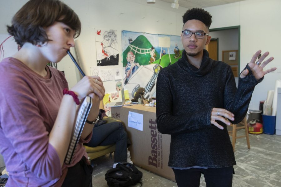 Flannery Black-Ingersoll '19, a double major in studio art and mathematics from Concord, N.H., listens as Calvin Reedy '17, a visual artist based in Brooklyn, N.Y., responds to her mixed media and figure painting work in progress. In February, Reedy gave a Bates Museum of Art gallery talk, “On Art and Justice,” and visited studio art majors. (Phyllis Graber Jensen/Bates College)