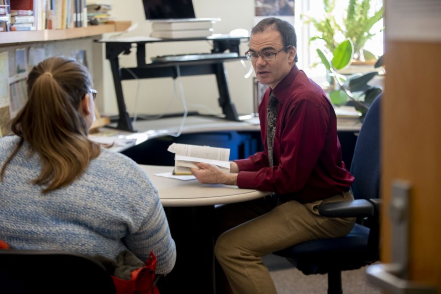 Sarah Douglas ’19, a history and English double major from Bryn Mawr, Pa., meets with her thesis adviser, Associate Professor of History Joe Hall, the professor who pedaled his way to campus.