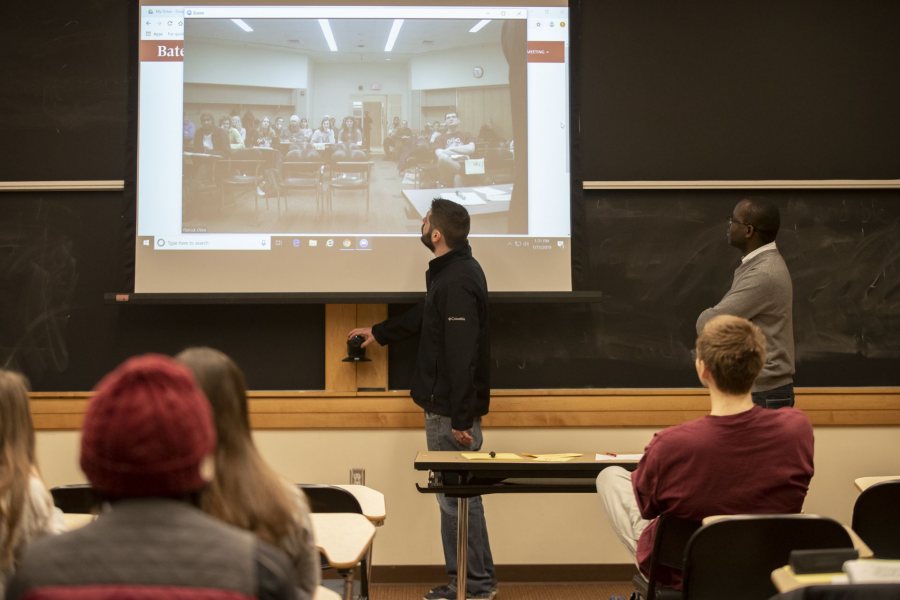 Ben Pinkham (center) an audio-visual analyst for Information & Library Services, arrives in Room G67 to straighten out a video-conferencing issue during a class that Assistant Professor of History Patrick Otim (right) team-teaches with Associate Professor of Anthropology Elizabeth Eames.