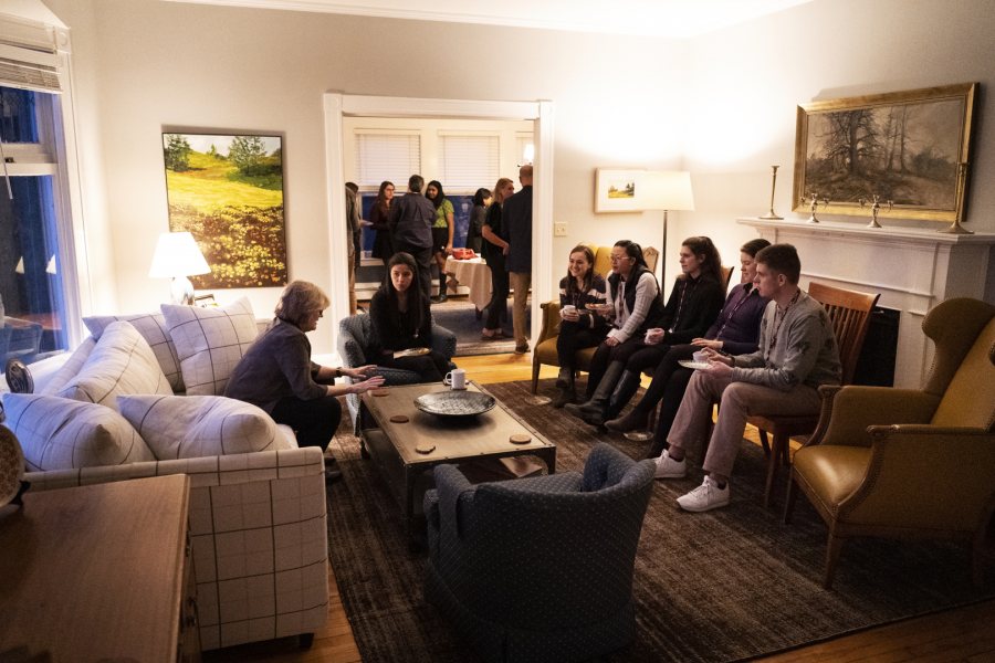 President Clayton Spencer speaks with students during a reception she hosted for Bates Fulbright semifinalists in February, a month that saw Bates announced as the fourth-ranked producer of Fulbright U.S. Student awards for 2018–19. (Theophil Syslo/Bates College)
