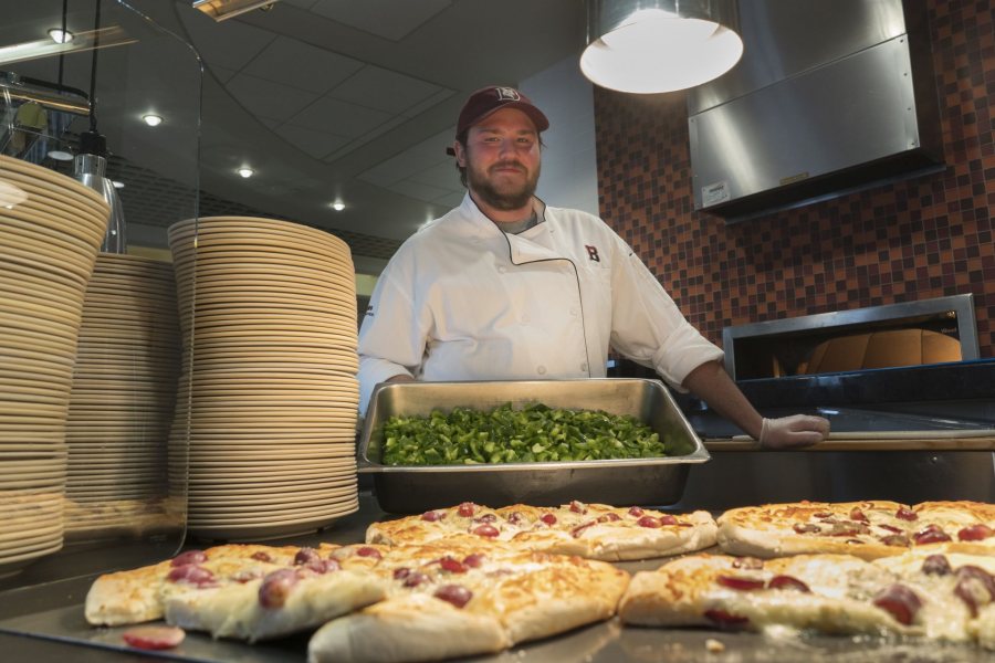 On a Sunday morning at the brick oven in Commons, Dining Services cook Jacob Morse preps work for the evening meal. Meanwhile, grape and Gorgonzola pizza is ready for brunch. (Phyllis Graber Jensen/Bates College)