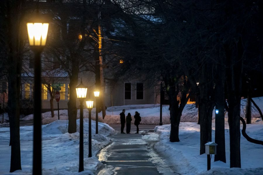 Conversations begun on campus paths often conclude at the corner of College Street and Campus Avenue as the conversers go their separate ways. (Phyllis Graber Jensen/Bates College)